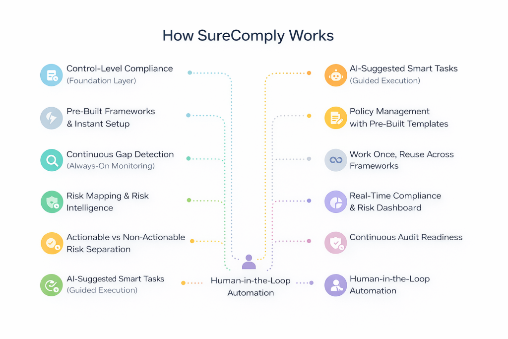 In simple terms, SureComply replaces manual, fragmented compliance processes with a centralized, intelligent system.